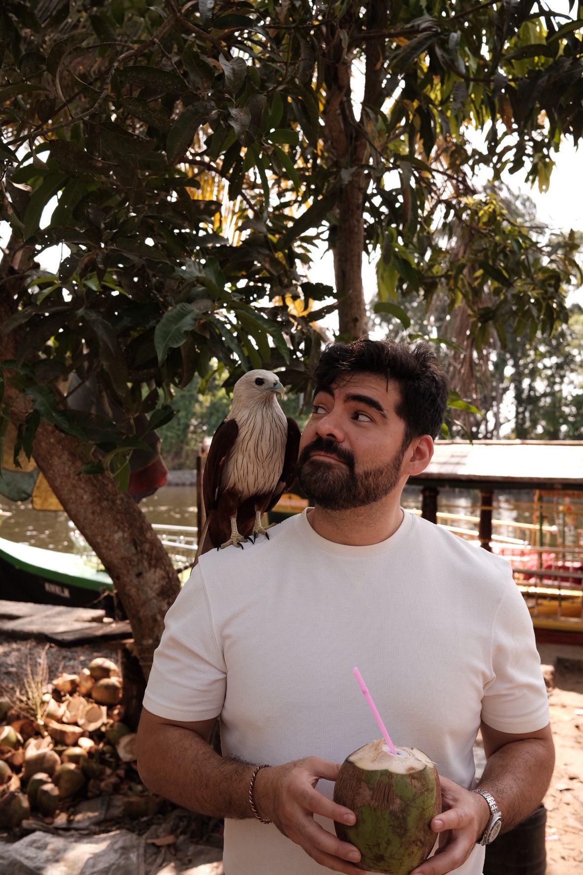 Durante el tour hicimos para a tomarnos un coco y tenían un pobre aguíla con las alas cortadas para tomarse fotos / During the tour we made a stop to drink a coconut and they had a poor eagle with the wings cut off for taking pictures.